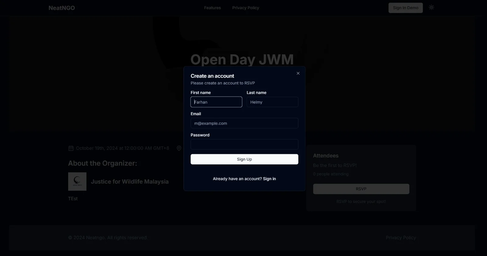Collaborated with Justice Wildlife Malaysia to handle their event registration and management, demonstrating the platform’s real-world application and effectiveness.